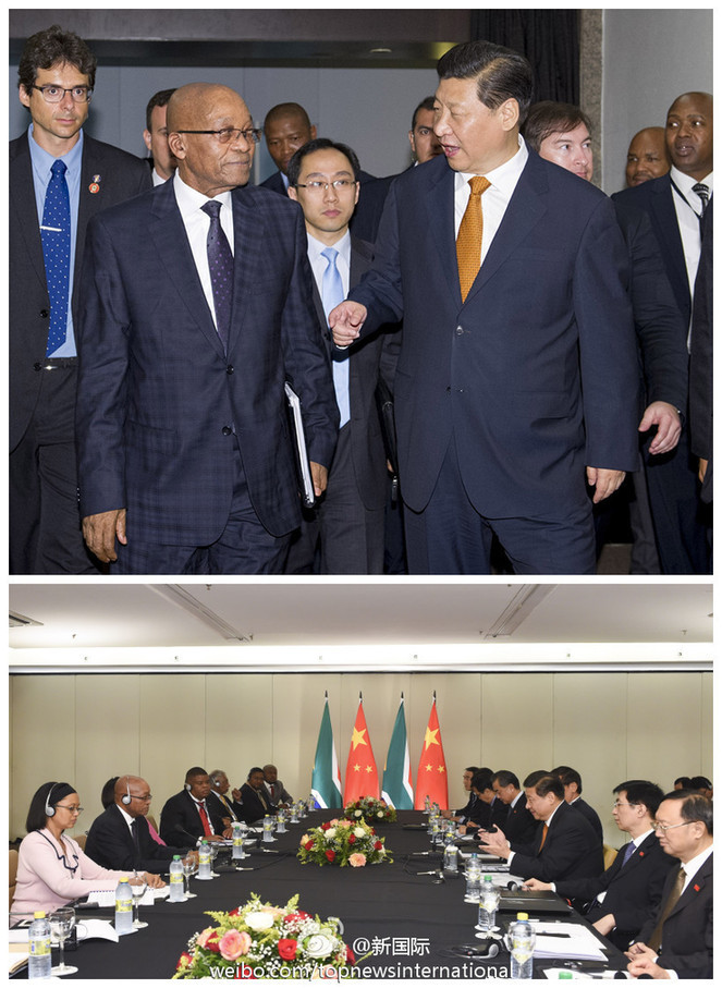 ???? 新華網(wǎng)北京7月15日電 據(jù)新華社“新國際”微博報道,習(xí)近平主席14日在巴西會見南非總統(tǒng)祖馬。習(xí)近平指出,和平與發(fā)展是非洲的主題。中非是命運共同體,我們愿意同非洲國家分享發(fā)展經(jīng)驗,積極參與非洲和平安全事務(wù),推進(jìn)非洲跨國跨區(qū)域互聯(lián)互通項目,為促進(jìn)非洲一體化作出更大貢獻(xiàn)。?
