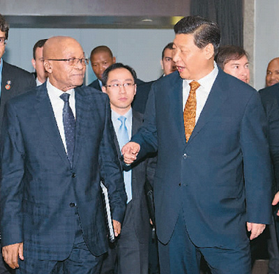 習(xí)近平表示,當(dāng)前,中南關(guān)系正面臨重要發(fā)展機(jī)遇期,合作潛力巨大,我們應(yīng)該乘勢(shì)而上,努力推動(dòng)中南關(guān)系再上新臺(tái)階。我歡迎祖馬總統(tǒng)下半年訪華,共同制定未來合作規(guī)劃。雙方要積極開展能源、礦業(yè)、農(nóng)業(yè)、裝備制造、基礎(chǔ)設(shè)施建設(shè)、鐵路機(jī)車、核電等領(lǐng)域合作,中方愿繼續(xù)配合南非辦好2014年中國南非年活動(dòng)。