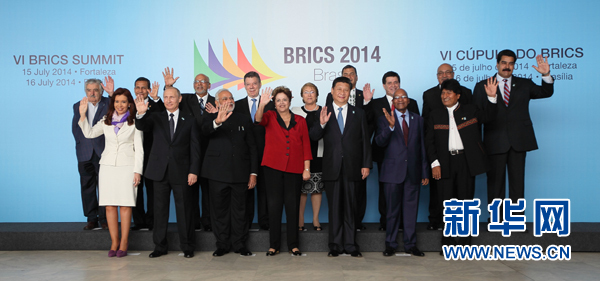 ????新華網(wǎng)巴西利亞7月16日電(記者陳威華、錢彤)7月16日,金磚國家同南美國家領(lǐng)導(dǎo)人對話會在巴西利亞舉行。中國國家主席習(xí)近平、巴西總統(tǒng)羅塞夫、俄羅斯總統(tǒng)普京、印度總理莫迪、南非總統(tǒng)祖馬以及蘇里南總統(tǒng)鮑特塞、阿根廷總統(tǒng)克里斯蒂娜、玻利維亞總統(tǒng)莫拉萊斯、哥倫比亞總統(tǒng)桑托斯、智利總統(tǒng)巴切萊特、厄瓜多爾總統(tǒng)科雷亞、圭亞那總統(tǒng)拉莫塔爾、巴拉圭總統(tǒng)卡特斯、秘魯總統(tǒng)烏馬拉、烏拉圭總統(tǒng)穆???、委內(nèi)瑞拉總統(tǒng)馬杜羅等南美國家領(lǐng)導(dǎo)人共同出席。