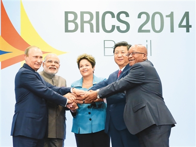 7月15日,習(xí)近平同出席會(huì)晤的巴西總統(tǒng)羅塞夫、俄羅斯總統(tǒng)普京、印度總理莫迪、南非總統(tǒng)祖馬合影。新華社記者 蘭紅光攝