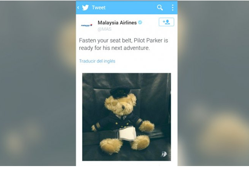據(jù)阿根廷Infobae網(wǎng)站7月17日報道,馬來西亞航空公司的MH17航班在烏克蘭東部墜毀后,該航空公司刪除了MH17航班出事前的最后一條官方推特。這條英文推特的內容是:系上安全帶,飛行員“派克”已經準備好了下一次旅程。推特還配了一張玩具熊假扮成飛行員準備起飛的照片。