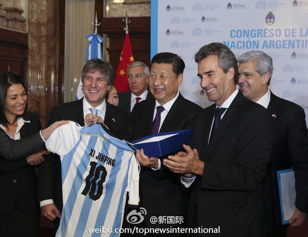 ????新華網(wǎng)北京7月20電 據(jù)新華社“新國際”微博報道,正在阿根廷進行國事訪問的國家主席習(xí)近平當?shù)貢r間19日上午會見了副總統(tǒng)兼參議長布杜和眾議長多明格斯。會見后,布杜向習(xí)近平主席贈送了阿根廷國家足球隊10號球衣。在剛結(jié)束的世界杯比賽中,阿根廷國家隊10號球員為梅西。