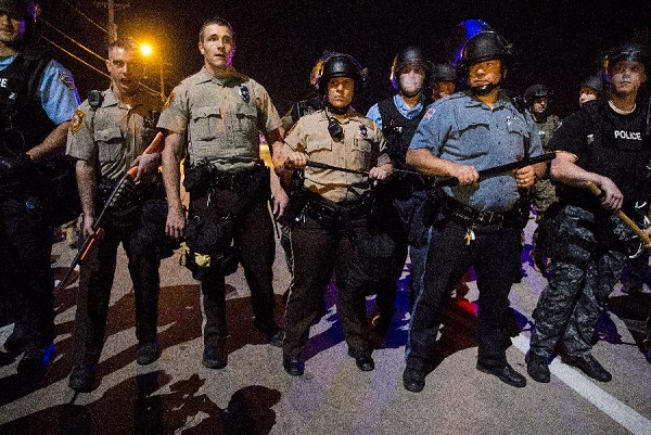 ??? 8月19日,警察在美國密蘇里州弗格森警戒。當(dāng)日,繼18歲黑人青年邁克爾·布朗9日下午被警方射殺后,密蘇里州圣路易斯市北部一非洲裔男子19日中午因涉嫌持刀襲警,被警察擊斃,導(dǎo)致弗格森街頭抗議升級。新華社發(fā)(沈霆攝)