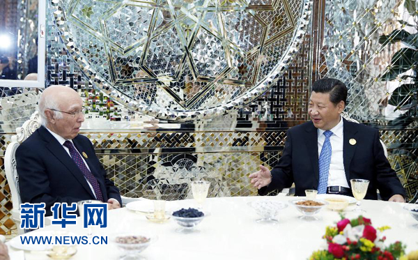 ????新華網(wǎng)杜尚別9月12日電(記者侯麗軍 劉紅霞)9月12日,國(guó)家主席習(xí)近平在杜尚別會(huì)見巴基斯坦總理國(guó)家安全和外事顧問阿齊茲。