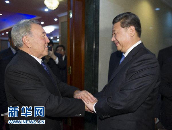 習近平指出,這是我們今年第四次見面。中哈保持密切高層交往,充分體現(xiàn)了中哈全面戰(zhàn)略伙伴關(guān)系的高水平和特殊性,對指導兩國關(guān)系發(fā)展非常重要。今年5月你對中國進行國事訪問并出席亞洲相互協(xié)作與信任措施會議第四次峰會,我們當時達成的各項共識正得到有效落實。你關(guān)心的擴大哈方農(nóng)產(chǎn)品和礦產(chǎn)資源對華出口問題,我已責成中方有關(guān)部門研究并正在積極解決。