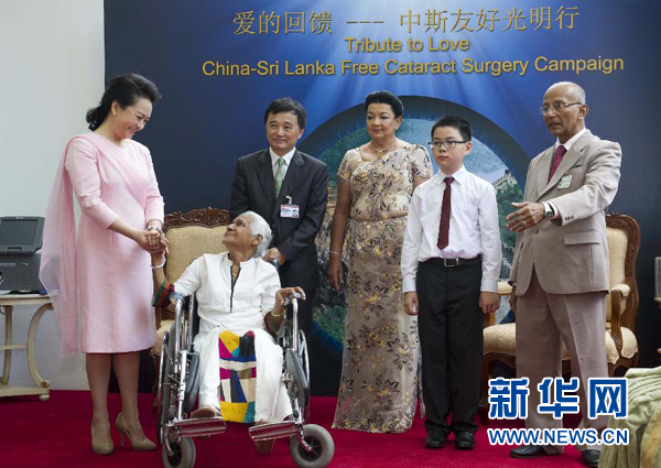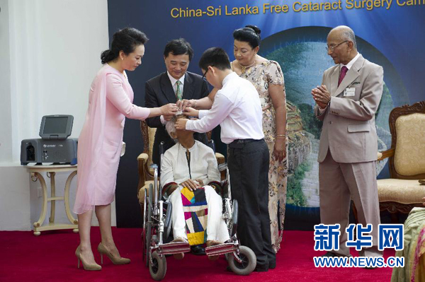 ????在兩國元首夫人共同見證下,許鵬飛為一位接受復(fù)明手術(shù)的斯里蘭卡白內(nèi)障患者揭開紗布。彭麗媛和施蘭蒂向在場的斯里蘭卡復(fù)明患者致以問候和祝福。彭麗媛向斯方贈(zèng)送白內(nèi)障手術(shù)儀器,鼓勵(lì)“中斯友好光明行”活動(dòng)繼續(xù)譜寫中斯友好交往的佳話。