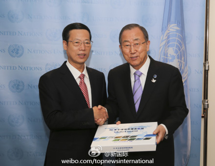 ????新華網北京9月23日電 據新華社“新國際”微博報道,國家主席習近平特使、國務院副總理張高麗22日在聯(lián)合國總部與聯(lián)合國秘書長潘基文共同出席中國政府向聯(lián)合國捐贈30米分辨率全球地表覆蓋數據儀式。張高麗表示,中國政府正式將世界上首套30米分辨率全球地表覆蓋數據捐贈給聯(lián)合國,這是為即將舉行的氣候峰會帶來的一份禮物。