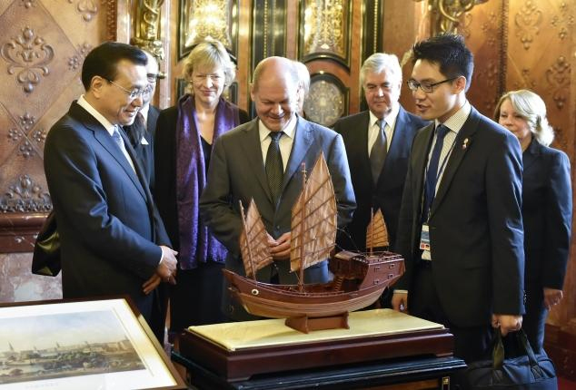 漢堡市政廳里,克強(qiáng)總理將一艘明代商船的復(fù)制模型,贈(zèng)給漢堡市市長肖爾茨。