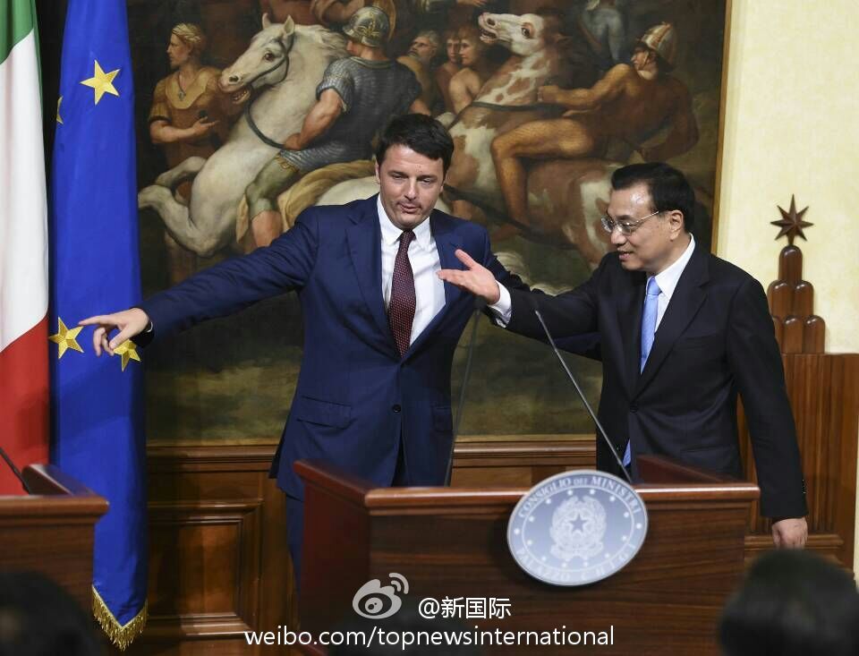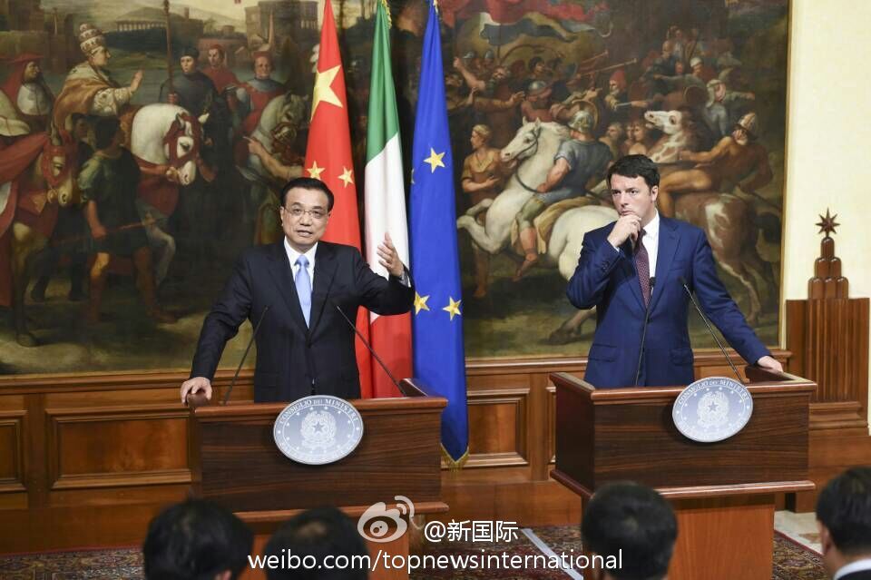 ??? 新華網(wǎng)北京10月15日電 據(jù)新華社“新國(guó)際”微博報(bào)道,國(guó)務(wù)院總理李克強(qiáng)14日與意大利總理倫齊在意總理府共同會(huì)見(jiàn)記者。李克強(qiáng)說(shuō),很高興來(lái)到不是一天建成的羅馬,中方不追求對(duì)意貿(mào)易順差,對(duì)擴(kuò)大中意貿(mào)易合作規(guī)模充滿信心,愿與意方繼續(xù)深挖務(wù)實(shí)合作。即將簽署的協(xié)議規(guī)模高達(dá)80億歐元,這說(shuō)明貿(mào)易投資規(guī)模還會(huì)擴(kuò)大。?