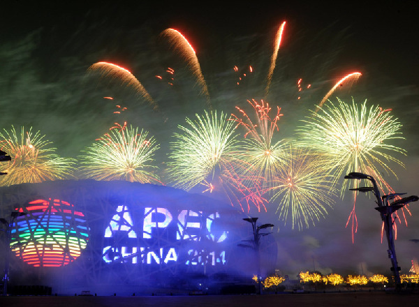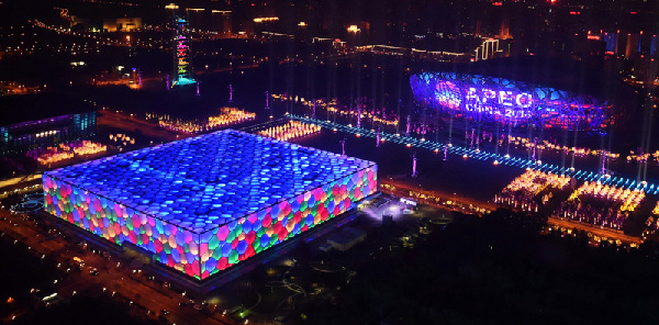 17時(shí)40分許,水立方和鳥巢的彩燈已經(jīng)在夜色中閃亮。當(dāng)晚,國(guó)家主席習(xí)近平和夫人彭麗媛在北京國(guó)家游泳中心(水立方)舉行宴會(huì),歡迎出席APEC會(huì)議的各成員經(jīng)濟(jì)體領(lǐng)導(dǎo)人或代表及配偶。