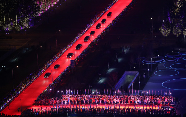 18時(shí)許,貴賓的車隊(duì)依次駛過(guò)鐳射燈照射鋪就的紅地毯,被迎領(lǐng)到水立方。歡迎人群載歌載舞,氣氛熱烈友好。