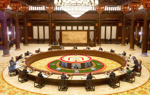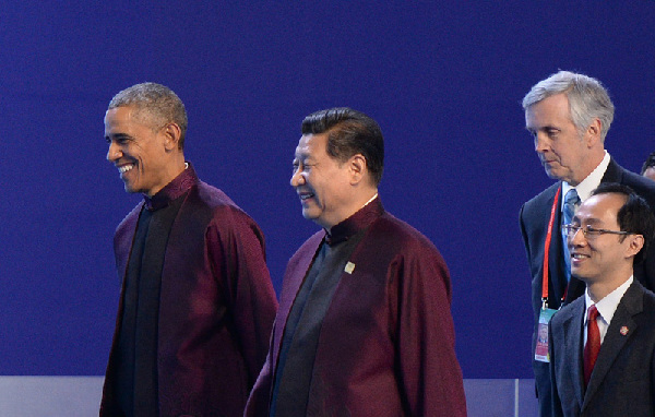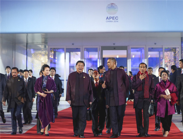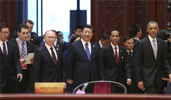 上午9時(shí)30分許,亞太經(jīng)合組織領(lǐng)導(dǎo)人非正式會(huì)議開(kāi)始在雁棲湖舉行。