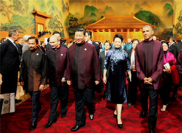 ????18時(shí)許,與會(huì)貴賓穿著為本次會(huì)議專門設(shè)計(jì)的特色中式服裝陸續(xù)抵達(dá)。習(xí)主席說(shuō),貴賓們都穿著中國(guó)式服裝,讓大家更感親近,就像到鄰居家串門,來(lái)朋友家敘舊一樣。