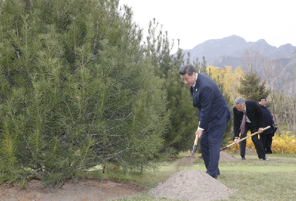 11時(shí)40分許,習(xí)主席與各成員經(jīng)濟(jì)體領(lǐng)導(dǎo)人或代表前往植樹(shù)。習(xí)主席在開(kāi)幕辭中希望,亞太經(jīng)濟(jì)體以北京雁棲湖為新的起點(diǎn),引領(lǐng)世界經(jīng)濟(jì)的雁陣,飛向更加蔚藍(lán)而遼闊的天空。
