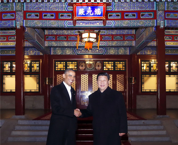 18時(shí)30分左右,習(xí)主席在中南海同美國(guó)總統(tǒng)奧巴馬舉行會(huì)晤。此時(shí)距習(xí)主席和奧巴馬身著中國(guó)式服裝在水立方出席晚宴,僅僅過(guò)去了24小時(shí)。