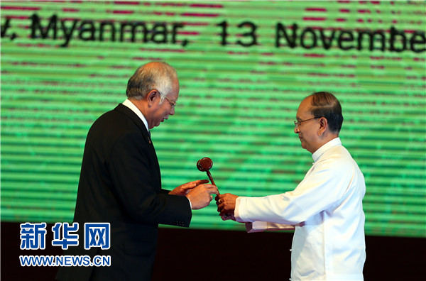????閉幕式上,馬來(lái)西亞總理納吉布從吳登盛手中接過(guò)象征東盟輪值主席國(guó)職權(quán)的金色木槌。馬來(lái)西亞將成為2015年?yáng)|盟輪值主席國(guó)。