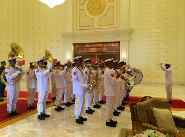11月14日,緬方軍樂隊(duì)在為李克強(qiáng)總理舉行的歡迎午宴上奏響兩國國歌。