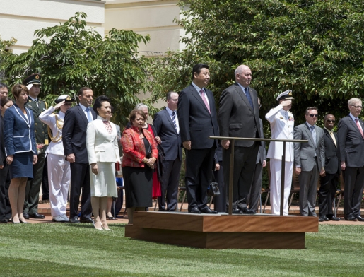 ??? 11月17日,澳大利亞總督科斯格羅夫在總督府草坪為習(xí)近平舉行隆重歡迎儀式。習(xí)近平和夫人彭麗媛抵達(dá)時(shí),受到科斯格羅夫總督夫婦熱情迎接。新華社記者李學(xué)仁攝