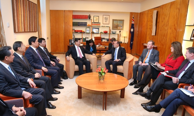 ??? 11月17日,中國(guó)國(guó)家主席習(xí)近平與澳大利亞總理阿博特在澳大利亞首都堪培拉舉行會(huì)談。新華社記者龐興雷攝