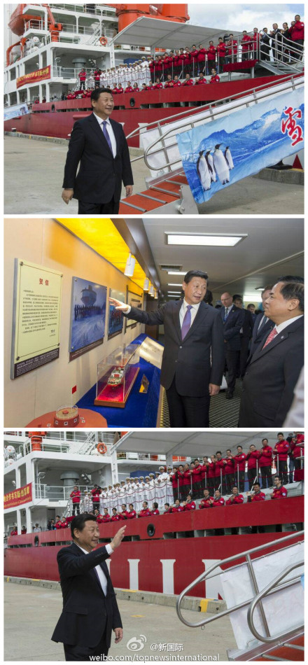 ??? 習近平攀舷梯,進船艙,參觀了極地考察30周年圖片展。在今年建成的南極泰山站模型前,他連著問:“站里多少人?”“現(xiàn)在南極是白天?”“能看電視嗎?”
