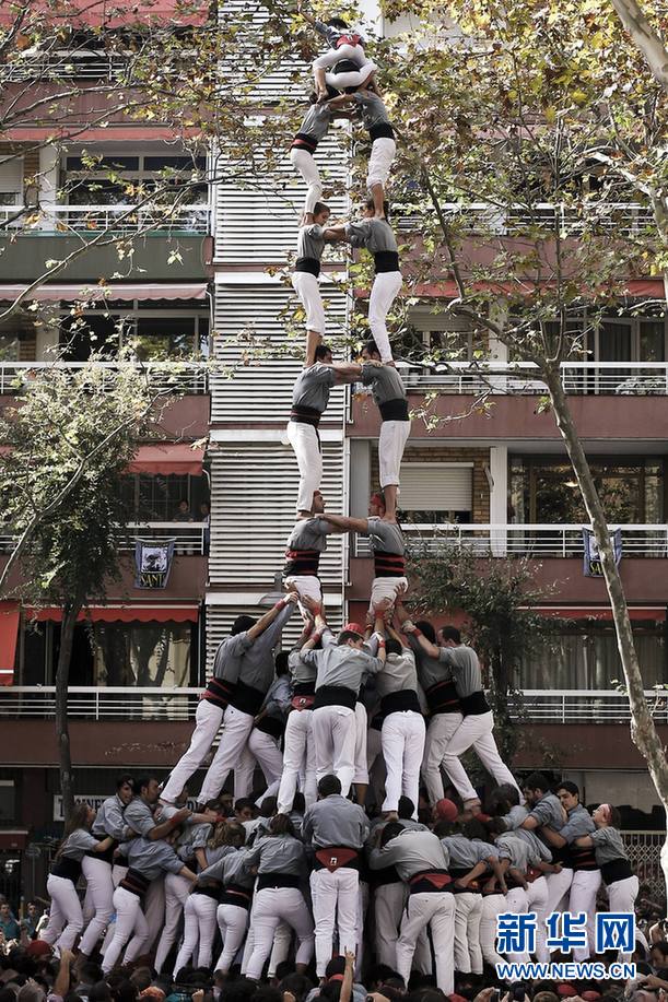 Jana在表演中爬到了“人塔”的頂部。新華社巴塞羅那分社攝影師Pau Barrena 攝