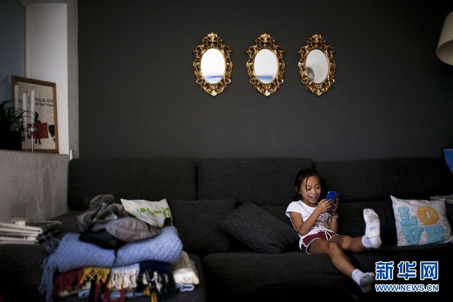 ????Jana坐在家里的沙發(fā)上玩養(yǎng)母Thais的智能手機(jī)。新華社巴塞羅那分社攝影師Pau Barrena 攝