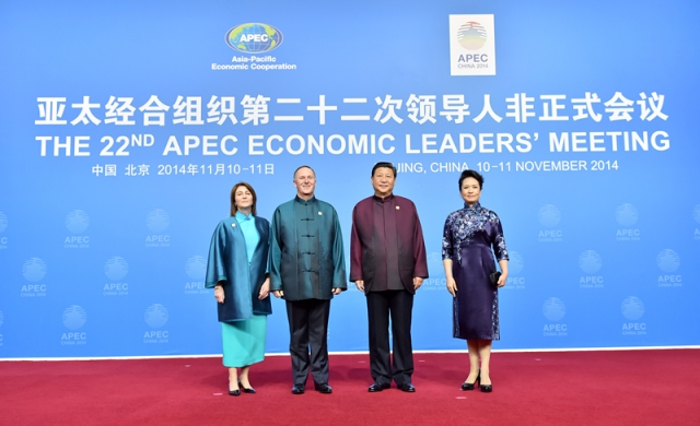 ??? (2014年11月10日,國家主席習(xí)近平和夫人彭麗媛迎候新西蘭總理約翰·基夫婦。新華社記者李濤攝)