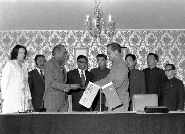????(1975年11月5日,中國(guó)與斐濟(jì)建交。圖為中國(guó)和斐濟(jì)在澳大利亞首都堪培拉簽署建交公報(bào)后,雙方代表交換文件。新華社發(fā))