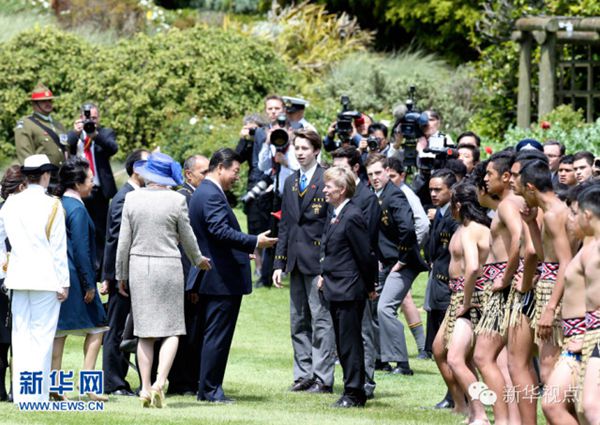 ????在總督府前的草坪上,5名勇士赤膊光足,身系草裙,一面揮舞長矛,一面吆喝,并不時吐出舌頭。為首的勇士緩緩走到習主席面前,將一把短劍投在地上,習主席俯身拾起。毛利族人確定習主席一行是為和平而來的善者。隨后,毛利族女子引吭高歌,數十名毛利族青少年跳起傳統(tǒng)的哈卡舞……