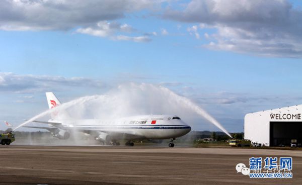 ???? ?11月21日,國家主席習近平抵達楠迪,開始對斐濟進行國事訪問并將同太平洋建交島國領導人舉行會晤。圖為習近平乘坐的專機在楠迪國際機場跑道上滑行穿過“水門”,這是當地給予最尊貴客人的禮遇,表達為客人“洗塵”。 新華社記者 丁林 攝