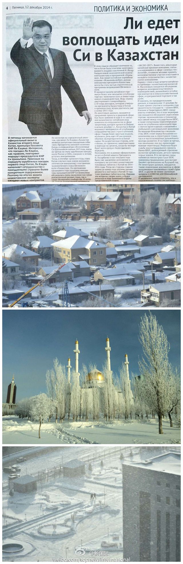 ????新華網(wǎng)北京12月13日電 據(jù)新華社“新國際”微博報道,哈薩克斯坦首都阿斯塔納冰天雪地,當?shù)馗鹘鐚羁藦妬碓L的期待卻相當熱切。總統(tǒng)府、總理府工作人員周末都在加緊籌備。哈通社記者穆卡諾夫說,中國總理來訪對他們來說是大新聞,他和同事將全程報道。他很關心哈中合作,希望中國的發(fā)展和經(jīng)驗能幫助哈更好發(fā)展。