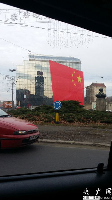 舊城米哈伊洛大公街附近,幾條馬路都掛起了中塞兩國(guó)的國(guó)旗。