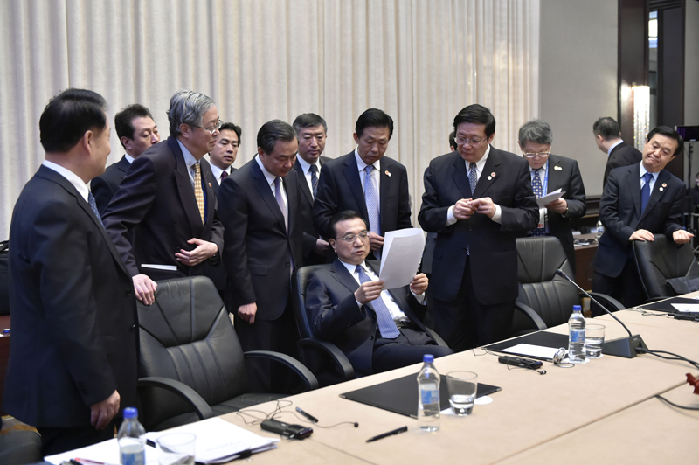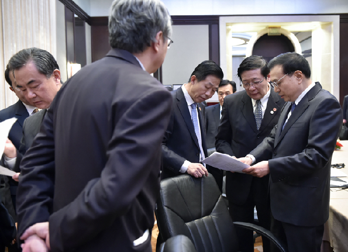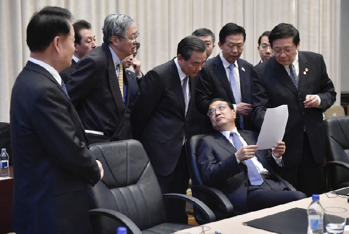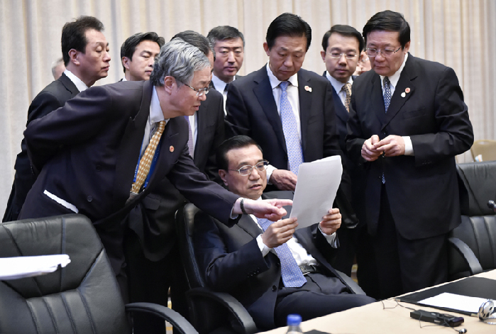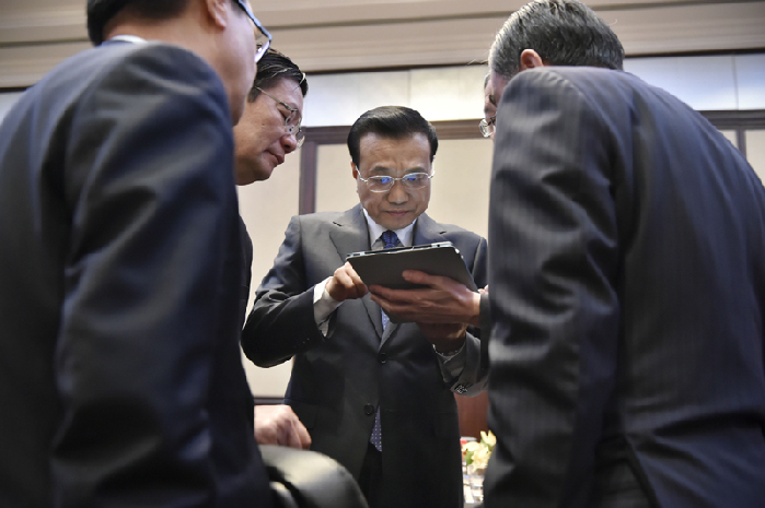 會(huì)議間隙的李克強(qiáng)。中新社 劉震 攝