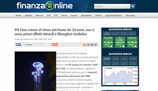 意大利財(cái)經(jīng)在線網(wǎng)站1月20日發(fā)表文章稱雖然2014年中國(guó)的國(guó)內(nèi)生產(chǎn)總值是24年來(lái)最低,但工業(yè)生產(chǎn)、零售業(yè)和股市都釋放出健康和積極的信號(hào)。