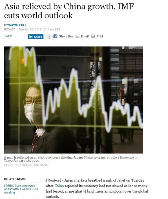路透社1月20日?qǐng)?bào)道稱中國(guó)經(jīng)濟(jì)發(fā)展腳步放緩程度仍舊保持在預(yù)期范圍內(nèi),并沒(méi)有許多人想象中的那樣嚴(yán)重,使得整個(gè)亞洲市場(chǎng)松了口氣。
