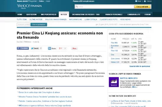 意大利askanews21日?qǐng)?bào)道稱中國(guó)國(guó)家總理李克強(qiáng)參加達(dá)沃斯經(jīng)濟(jì)論壇并發(fā)表講話,向世界傳達(dá)了一個(gè)令人放心的信息——中國(guó)經(jīng)濟(jì)不會(huì)進(jìn)入硬著陸階段,經(jīng)濟(jì)增長(zhǎng)不會(huì)遭遇急剎車。