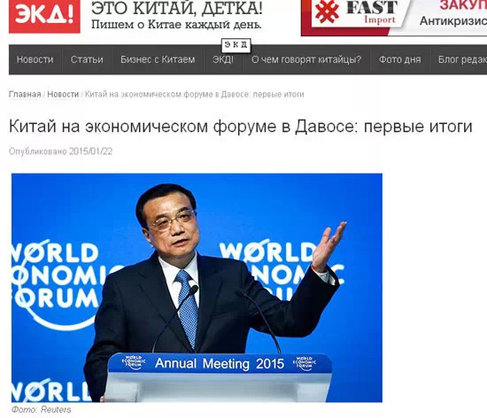 以介紹中國(guó)社會(huì)和經(jīng)濟(jì)發(fā)展為主的網(wǎng)站chinababe.ru22日發(fā)表文章,盤點(diǎn)了中國(guó)在此次達(dá)沃斯論壇上取得的初步成果。文章稱,中國(guó)代表團(tuán)由李克強(qiáng)總理率領(lǐng)。目前,中國(guó)是世界第二大經(jīng)濟(jì)體,國(guó)際社會(huì)非常關(guān)注中國(guó)的經(jīng)濟(jì)發(fā)展規(guī)模和速度。在論壇期間,李克強(qiáng)總理有關(guān)中國(guó)經(jīng)濟(jì)轉(zhuǎn)型,特別是對(duì)中國(guó)經(jīng)濟(jì)增長(zhǎng)速度的闡釋打消了國(guó)際社會(huì)的顧慮。