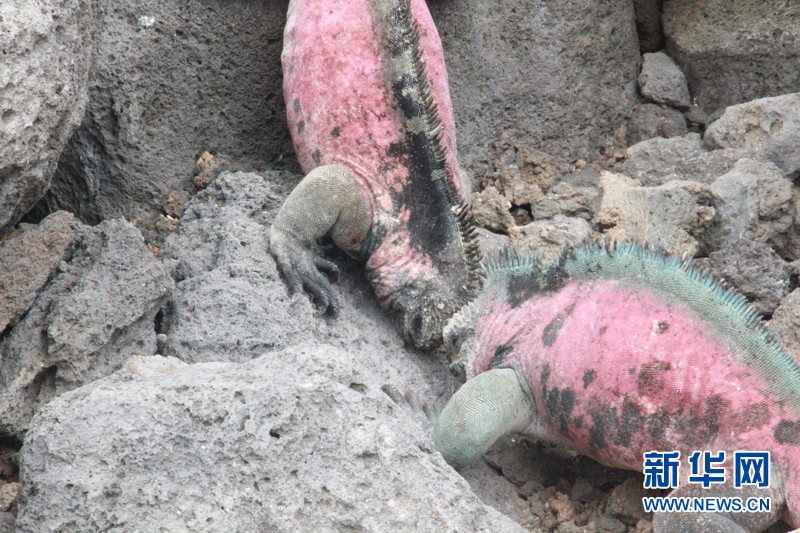 兩只佛羅雷阿納島上的海鬣蜥在爭(zhēng)奪地盤。到了繁殖期的海鬣蜥皮膚會(huì)呈現(xiàn)出大紅大綠的顏色,情緒也會(huì)高漲起來。