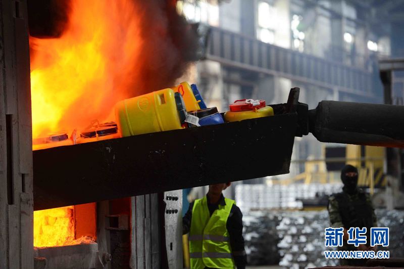 ?6月25日,在位于烏茲別克斯坦首都塔什干市郊的一家工廠內,禁毒人員銷毀毒品。
