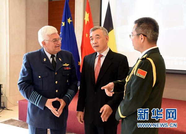??? 7月23日,中國駐比利時(shí)大使曲星(中)、比利時(shí)國防參謀長范卡倫貝格(Gerard Van Caelenberge)(左)與中國駐比利時(shí)王國陸、海、空三軍武官郜彤在招待會(huì)上友好交談。新華社記者姜巖攝