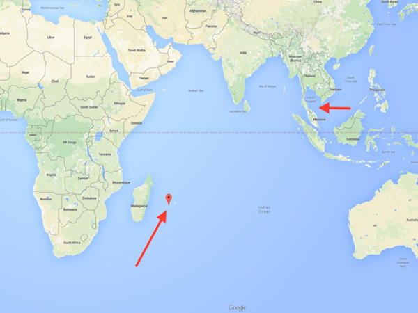 ?。ㄗ髠燃^是殘骸發(fā)現(xiàn)地,右側為MH370最后信號的發(fā)出地)