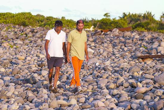 當?shù)貢r間7月30日,約翰尼·貝格(右)和朋友一起在海灘上行走,他正是在法屬留尼旺島上發(fā)現(xiàn)疑似MH370殘骸的人。CFP供圖