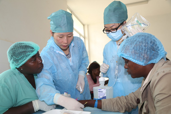 2014年12月10日,解放軍援塞醫(yī)療隊(duì)為中塞友好醫(yī)院由留觀中心轉(zhuǎn)型為留觀診療中心開(kāi)展輸液培訓(xùn)活動(dòng)。這是中方隊(duì)員在教授塞方護(hù)理人員留置針的穿刺方法。 新華社發(fā)(戴欣 攝)