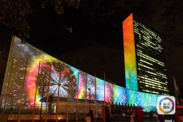 ↑9月22日,聯(lián)合國總部大樓外投影顯示可持續(xù)發(fā)展目標宣傳畫面。(新華社記者李木子攝)