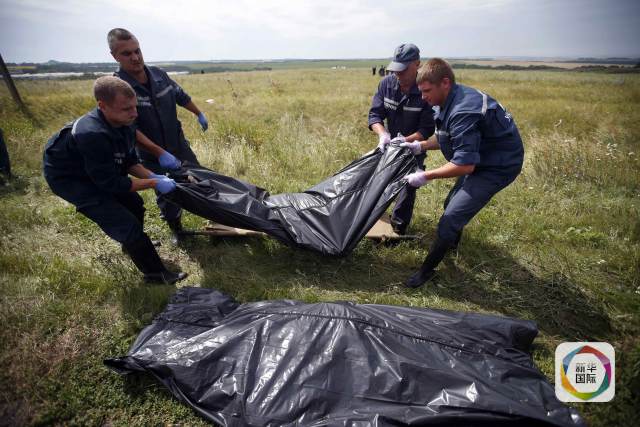 2014年7月19日,在烏克蘭頓涅茨克州的MH17航班墜機現(xiàn)場,烏克蘭緊急情況部工作人員搬運遇難者遺體。新華社/路透