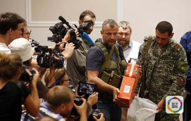 2014年7月22日凌晨,在烏克蘭頓涅茨克州,烏克蘭東部民間武裝代表正在向媒體展示黑匣子。烏克蘭東部民間武裝領(lǐng)導(dǎo)人、“頓涅茨克人民共和國”總理博羅代22日凌晨將馬航MH17航班客機黑匣子交給馬來西亞方面。新華社/路透
