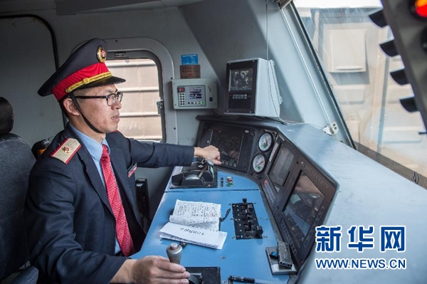 10月15日,第1000列中歐班列開行前,重慶機(jī)務(wù)段執(zhí)行本次班列駕駛?cè)蝿?wù)的司機(jī)王銘杰在駕駛室內(nèi)進(jìn)行開行前的操作。當(dāng)日11時45分,載著筆記本電腦等51個集裝箱貨物的中歐班列,緩緩駛出重慶團(tuán)結(jié)村站,駛向1.1萬公里之外的德國杜伊斯堡。這是第1000列往來中國和歐洲之間的國際貨運(yùn)列車。新華社記者劉潺攝
