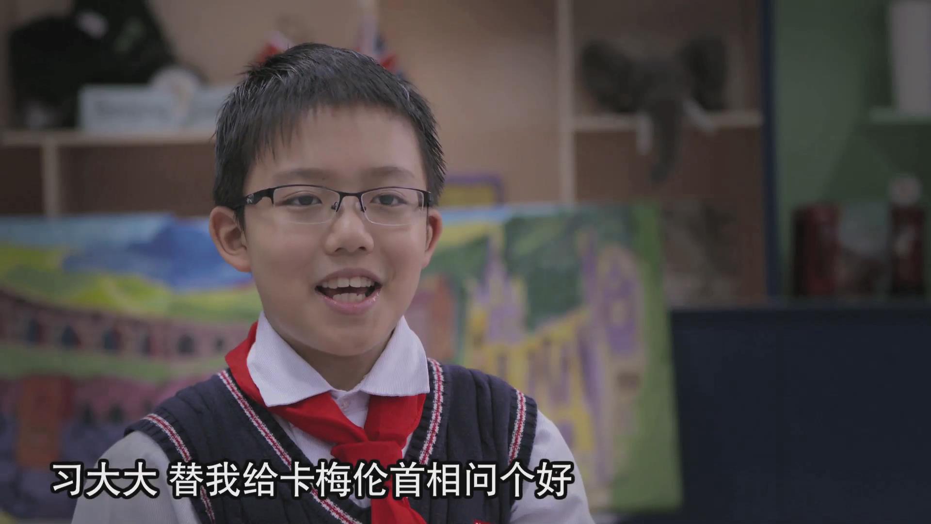 短片結(jié)尾處還有“彩蛋”,成都龍江路小學(xué)分校學(xué)生鮮博文最后說:“習(xí)大大,替我給卡梅倫首相問個好,我見過他的!”