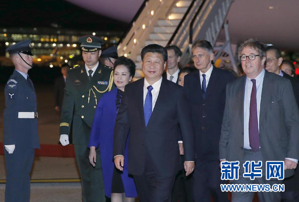 當(dāng)?shù)貢r(shí)間晚8時(shí)許,習(xí)近平乘坐的專機(jī)抵達(dá)倫敦希思羅機(jī)場(chǎng)。習(xí)近平和夫人彭麗媛在機(jī)場(chǎng)受到英國(guó)女王代表胡德子爵、外交大臣哈蒙德等熱情迎接。英國(guó)青年向習(xí)近平夫婦獻(xiàn)上鮮花。