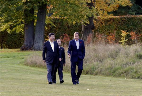 傍晚時(shí)分,習(xí)近平主席來(lái)到距倫敦市區(qū)約1小時(shí)車程的契克斯首相鄉(xiāng)間別墅,同卡梅倫一起散步,并舉行小范圍會(huì)晤。